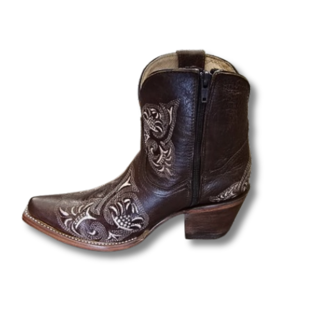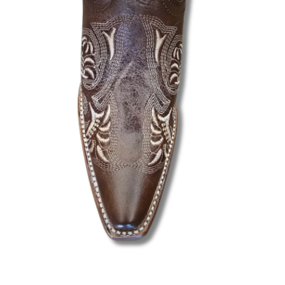 Botines vaqueros para mujer de piel genuina color café con bordado estilo western. Diseñados con punta fina y tacón cubano, ofrecen un look elegante y auténtico estilo vaquero.